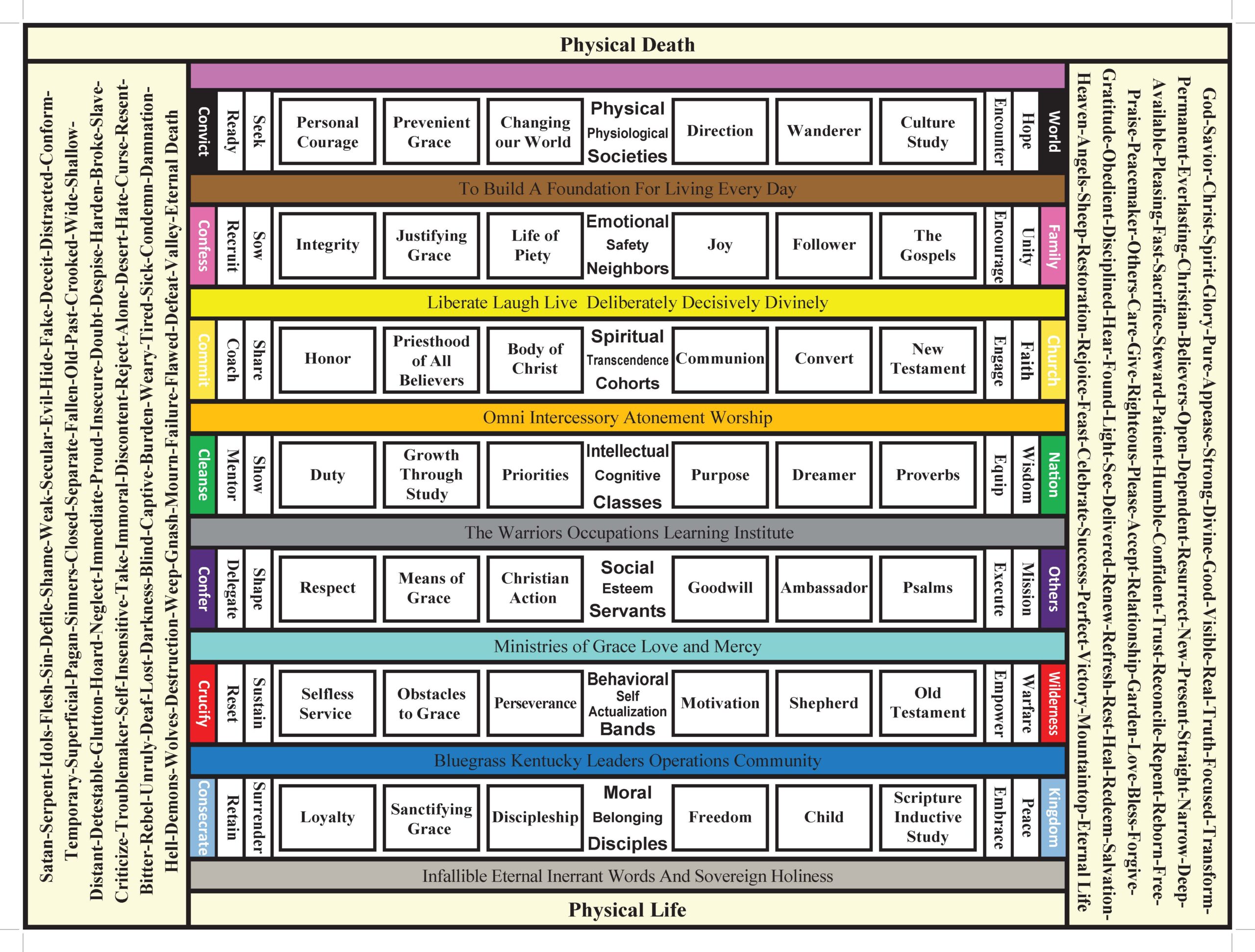 Send others as Warfighters, Leaders, Educators to labor across the Lord’s great, diverse Harvest field (Matthew 9:35) of secular life planting seeds (Matthew 13:1-8) in groups of two or more in the name and presence of Christ (Matthew 18:20) and in fearful, disciplined, committed obedience of a divine, demanding, jealous, patient, slow to anger, wrathful, avenging, just, compassionate, forgiving, redeeming, cleansing, convicting, guiding, trusting, good, fair, righteous, merciful, loving, faithful, giving, unfailing, truthful, honorable, deliberate, refining, purifying, purposeful, affirming, committed God, our everlasting, Sovereign, Heavenly Father, who judges and saves his children not by righteous works only but by free, undeserved Grace through Faith so they may receive everlasting, Eternal Salvation – Life rather than being condemned to everlasting, Eternal Punishment, Damnation – Death.